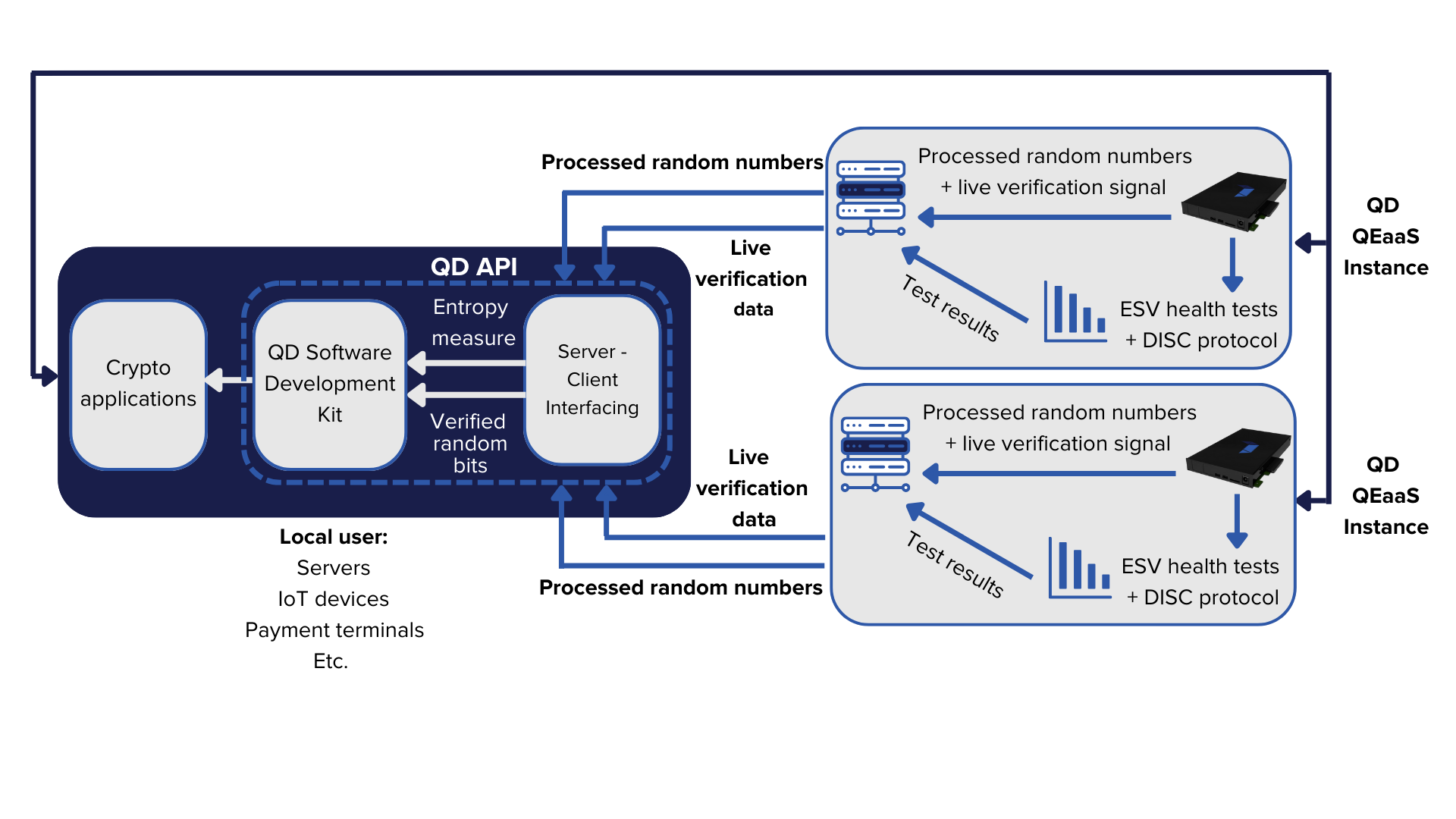 - Seamless Scaling via Remote Access – Removing the need for clients to host or manage hardware, Quantum Dice created a solution that allows for the efficient distribution of high-quality entropy to multiple endpoints on demand. QEaaS presents a low-cost way to send high quality entropy to devices throughout a network.